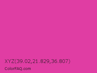 XYZ 39.02,21.829,36.807 Color is a normal magenta color and the nearest color is Frostbite #e936a7. Hex code #e03da3 and RGB value is rgb(224,61,163). In RGB color space, this color is composed of 88% red, 24% green, 64% blue, In CMYK color space, this color is composed of 0% cyan, 73% magenta, 27% yellow , 12% black , In HSL color space, this color has a hue angle of 322° , 72% saturation and 56% lightness.