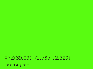 XYZ 39.031,71.785,12.329 Color is a normal green color and the nearest color is Bright Green #66ff00. Hex code #59fc11 and RGB value is rgb(89,252,17). In RGB color space, this color is composed of 35% red, 99% green, 7% blue, In CMYK color space, this color is composed of 65% cyan, 0% magenta, 93% yellow , 1% black , In HSL color space, this color has a hue angle of 102° , 98% saturation and 53% lightness.