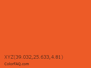 XYZ 39.032,25.633,4.81 Color is a normal orange color and the nearest color is Flamingo #f2552a. Hex code #ed5b27 and RGB value is rgb(237,91,39). In RGB color space, this color is composed of 93% red, 36% green, 15% blue, In CMYK color space, this color is composed of 0% cyan, 62% magenta, 84% yellow , 7% black , In HSL color space, this color has a hue angle of 16° , 85% saturation and 54% lightness.