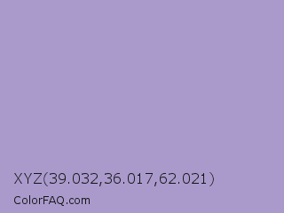 XYZ 39.032,36.017,62.021 Color is a light indigo color and the nearest color is East Side #ac91ce. Hex code #aa9acc and RGB value is rgb(170,154,204). In RGB color space, this color is composed of 67% red, 60% green, 80% blue, In CMYK color space, this color is composed of 17% cyan, 25% magenta, 0% yellow , 20% black , In HSL color space, this color has a hue angle of 259° , 33% saturation and 70% lightness.