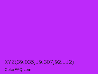 XYZ 39.035,19.307,92.112 Color is a normal purple color and the nearest color is Veronica #a020f0. Hex code #bd29fa and RGB value is rgb(189,41,250). In RGB color space, this color is composed of 74% red, 16% green, 98% blue, In CMYK color space, this color is composed of 24% cyan, 84% magenta, 0% yellow , 2% black , In HSL color space, this color has a hue angle of 282° , 95% saturation and 57% lightness.