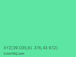 XYZ 39.035,61.376,43.972 Color is a light green color and the nearest color is Medium Aquamarine #66ddaa. Hex code #5ae6a2 and RGB value is rgb(90,230,162). In RGB color space, this color is composed of 35% red, 90% green, 64% blue, In CMYK color space, this color is composed of 61% cyan, 0% magenta, 30% yellow , 10% black , In HSL color space, this color has a hue angle of 151° , 74% saturation and 63% lightness.