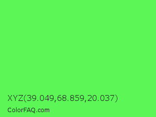 XYZ 39.049,68.859,20.037 Color is a light green color and the nearest color is Screamin Green #66ff66. Hex code #5cf656 and RGB value is rgb(92,246,86). In RGB color space, this color is composed of 36% red, 96% green, 34% blue, In CMYK color space, this color is composed of 63% cyan, 0% magenta, 65% yellow , 4% black , In HSL color space, this color has a hue angle of 118° , 90% saturation and 65% lightness.