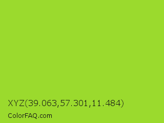 XYZ 39.063,57.301,11.484 Color is a normal green color and the nearest color is Atlantis #97cd2d. Hex code #9bda2d and RGB value is rgb(155,218,45). In RGB color space, this color is composed of 61% red, 85% green, 18% blue, In CMYK color space, this color is composed of 29% cyan, 0% magenta, 79% yellow , 15% black , In HSL color space, this color has a hue angle of 82° , 70% saturation and 52% lightness.