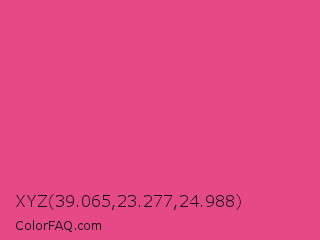 XYZ 39.065,23.277,24.988 Color is a normal rose color and the nearest color is Fandango Pink #de5285. Hex code #e54a86 and RGB value is rgb(229,74,134). In RGB color space, this color is composed of 90% red, 29% green, 53% blue, In CMYK color space, this color is composed of 0% cyan, 68% magenta, 41% yellow , 10% black , In HSL color space, this color has a hue angle of 337° , 75% saturation and 59% lightness.