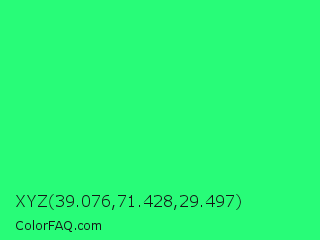 XYZ 39.076,71.428,29.497 Color is a normal green color and the nearest color is Spring Green #00ff7f. Hex code #28fc78 and RGB value is rgb(40,252,120). In RGB color space, this color is composed of 16% red, 99% green, 47% blue, In CMYK color space, this color is composed of 84% cyan, 0% magenta, 52% yellow , 1% black , In HSL color space, this color has a hue angle of 143° , 97% saturation and 57% lightness.