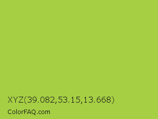XYZ 39.082,53.15,13.668 Color is a normal lime color and the nearest color is Android Green #a4c639. Hex code #a6cf44 and RGB value is rgb(166,207,68). In RGB color space, this color is composed of 65% red, 81% green, 27% blue, In CMYK color space, this color is composed of 20% cyan, 0% magenta, 67% yellow , 19% black , In HSL color space, this color has a hue angle of 78° , 59% saturation and 54% lightness.