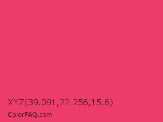 XYZ 39.091,22.256,15.6 Color is a normal red color and the nearest color is Paradise Pink #e63e62. Hex code #ed3c69 and RGB value is rgb(237,60,105). In RGB color space, this color is composed of 93% red, 24% green, 41% blue, In CMYK color space, this color is composed of 0% cyan, 75% magenta, 56% yellow , 7% black , In HSL color space, this color has a hue angle of 345° , 83% saturation and 58% lightness.