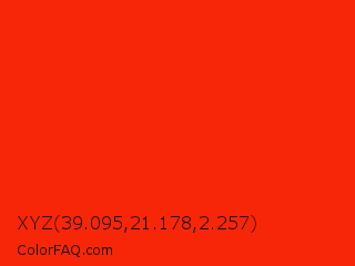 XYZ 39.095,21.178,2.257 Color is a normal red color and the nearest color is Ferrari Red #ff2800. Hex code #f72608 and RGB value is rgb(247,38,8). In RGB color space, this color is composed of 97% red, 15% green, 3% blue, In CMYK color space, this color is composed of 0% cyan, 85% magenta, 97% yellow , 3% black , In HSL color space, this color has a hue angle of 8° , 94% saturation and 50% lightness.