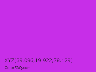 XYZ 39.096,19.922,78.129 Color is a normal purple color and the nearest color is Steel Pink #cc33cc. Hex code #c72ee8 and RGB value is rgb(199,46,232). In RGB color space, this color is composed of 78% red, 18% green, 91% blue, In CMYK color space, this color is composed of 14% cyan, 80% magenta, 0% yellow , 9% black , In HSL color space, this color has a hue angle of 289° , 80% saturation and 55% lightness.