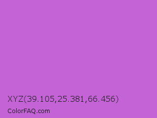 XYZ 39.105,25.381,66.456 Color is a light purple color and the nearest color is Rich Lilac #b666d2. Hex code #c363d6 and RGB value is rgb(195,99,214). In RGB color space, this color is composed of 76% red, 39% green, 84% blue, In CMYK color space, this color is composed of 9% cyan, 54% magenta, 0% yellow , 16% black , In HSL color space, this color has a hue angle of 290° , 58% saturation and 61% lightness.