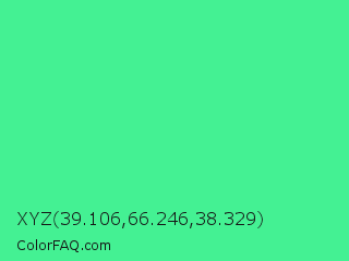 XYZ 39.106,66.246,38.329 Color is a light green color and the nearest color is Eucalyptus #44d7a8. Hex code #44f193 and RGB value is rgb(68,241,147). In RGB color space, this color is composed of 27% red, 95% green, 58% blue, In CMYK color space, this color is composed of 72% cyan, 0% magenta, 39% yellow , 5% black , In HSL color space, this color has a hue angle of 147° , 86% saturation and 61% lightness.