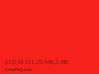 XYZ 39.111,20.946,3.08 Color is a normal red color and the nearest color is Red RYB #fe2712. Hex code #f7211c and RGB value is rgb(247,33,28). In RGB color space, this color is composed of 97% red, 13% green, 11% blue, In CMYK color space, this color is composed of 0% cyan, 87% magenta, 89% yellow , 3% black , In HSL color space, this color has a hue angle of 1° , 93% saturation and 54% lightness.