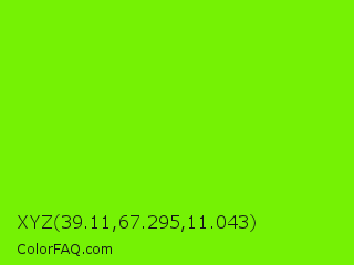 XYZ 39.11,67.295,11.043 Color is a normal green color and the nearest color is Lawn Green #7cfc00. Hex code #75f204 and RGB value is rgb(117,242,4). In RGB color space, this color is composed of 46% red, 95% green, 2% blue, In CMYK color space, this color is composed of 52% cyan, 0% magenta, 98% yellow , 5% black , In HSL color space, this color has a hue angle of 92° , 97% saturation and 48% lightness.