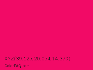 XYZ 39.125,20.054,14.379 Color is a normal rose color and the nearest color is Vivid Raspberry #ff006c. Hex code #f20a66 and RGB value is rgb(242,10,102). In RGB color space, this color is composed of 95% red, 4% green, 40% blue, In CMYK color space, this color is composed of 0% cyan, 96% magenta, 58% yellow , 5% black , In HSL color space, this color has a hue angle of 336° , 92% saturation and 49% lightness.