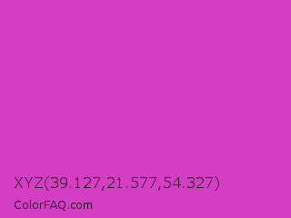 XYZ 39.127,21.577,54.327 Color is a normal magenta color and the nearest color is Steel Pink #cc33cc. Hex code #d53ec4 and RGB value is rgb(213,62,196). In RGB color space, this color is composed of 84% red, 24% green, 77% blue, In CMYK color space, this color is composed of 0% cyan, 71% magenta, 8% yellow , 16% black , In HSL color space, this color has a hue angle of 307° , 64% saturation and 54% lightness.