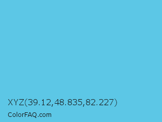 XYZ 39.12,48.835,82.227 Color is a light cyan color and the nearest color is Viking #64ccdb. Hex code #5cc7e6 and RGB value is rgb(92,199,230). In RGB color space, this color is composed of 36% red, 78% green, 90% blue, In CMYK color space, this color is composed of 60% cyan, 13% magenta, 0% yellow , 10% black , In HSL color space, this color has a hue angle of 193° , 73% saturation and 63% lightness.