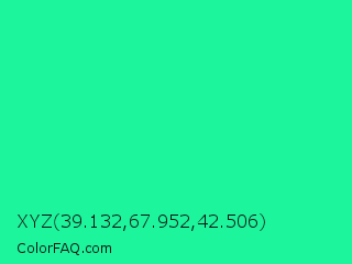 XYZ 39.132,67.952,42.506 Color is a normal green color and the nearest color is Medium Spring Green #00fa9a. Hex code #1cf59c and RGB value is rgb(28,245,156). In RGB color space, this color is composed of 11% red, 96% green, 61% blue, In CMYK color space, this color is composed of 89% cyan, 0% magenta, 36% yellow , 4% black , In HSL color space, this color has a hue angle of 155° , 92% saturation and 54% lightness.