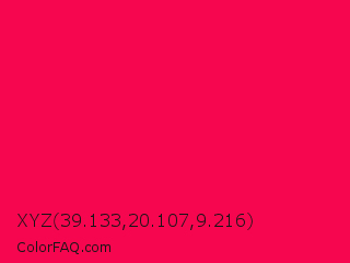 XYZ 39.133,20.107,9.216 Color is a normal rose color and the nearest color is Folly #ff004f. Hex code #f5064f and RGB value is rgb(245,6,79). In RGB color space, this color is composed of 96% red, 2% green, 31% blue, In CMYK color space, this color is composed of 0% cyan, 98% magenta, 68% yellow , 4% black , In HSL color space, this color has a hue angle of 342° , 95% saturation and 49% lightness.