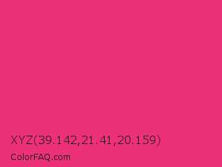 XYZ 39.142,21.41,20.159 Color is a normal rose color and the nearest color is Cerise Pink #ec3b83. Hex code #ec3179 and RGB value is rgb(236,49,121). In RGB color space, this color is composed of 93% red, 19% green, 47% blue, In CMYK color space, this color is composed of 0% cyan, 79% magenta, 49% yellow , 7% black , In HSL color space, this color has a hue angle of 337° , 83% saturation and 56% lightness.