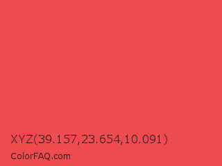XYZ 39.157,23.654,10.091 Color is a light red color and the nearest color is Carmine Pink #eb4c42. Hex code #ee4a50 and RGB value is rgb(238,74,80). In RGB color space, this color is composed of 93% red, 29% green, 31% blue, In CMYK color space, this color is composed of 0% cyan, 69% magenta, 66% yellow , 7% black , In HSL color space, this color has a hue angle of 358° , 83% saturation and 61% lightness.