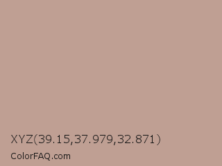 XYZ 39.15,37.979,32.871 Color is a light orange color and the nearest color is Tuscany #c09999. Hex code #bf9f93 and RGB value is rgb(191,159,147). In RGB color space, this color is composed of 75% red, 62% green, 58% blue, In CMYK color space, this color is composed of 0% cyan, 17% magenta, 23% yellow , 25% black , In HSL color space, this color has a hue angle of 16° , 26% saturation and 66% lightness.
