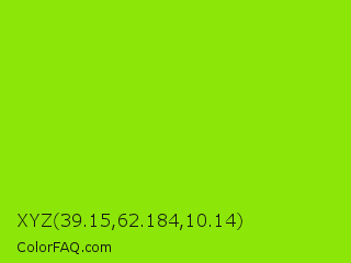 XYZ 39.15,62.184,10.14 Color is a normal green color and the nearest color is Alien Armpit #84de02. Hex code #8ce607 and RGB value is rgb(140,230,7). In RGB color space, this color is composed of 55% red, 90% green, 3% blue, In CMYK color space, this color is composed of 39% cyan, 0% magenta, 97% yellow , 10% black , In HSL color space, this color has a hue angle of 84° , 94% saturation and 46% lightness.