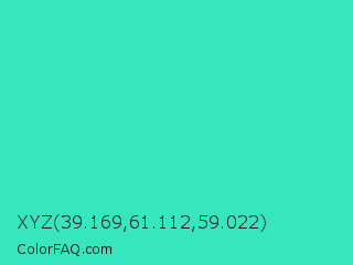 XYZ 39.169,61.112,59.022 Color is a normal cyan color and the nearest color is Turquoise PWG #30d5c8. Hex code #35e6bf and RGB value is rgb(53,230,191). In RGB color space, this color is composed of 21% red, 90% green, 75% blue, In CMYK color space, this color is composed of 77% cyan, 0% magenta, 17% yellow , 10% black , In HSL color space, this color has a hue angle of 167° , 78% saturation and 55% lightness.