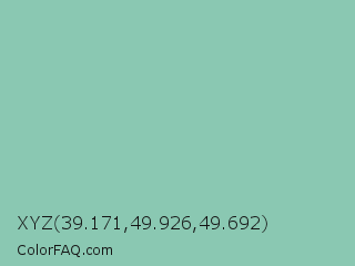 XYZ 39.171,49.926,49.692 Color is a light green color and the nearest color is Vista Blue #8fd6b4. Hex code #8ac8b2 and RGB value is rgb(138,200,178). In RGB color space, this color is composed of 54% red, 78% green, 70% blue, In CMYK color space, this color is composed of 31% cyan, 0% magenta, 11% yellow , 22% black , In HSL color space, this color has a hue angle of 159° , 36% saturation and 66% lightness.
