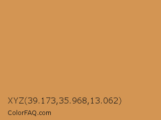 XYZ 39.173,35.968,13.062 Color is a normal orange color and the nearest color is Persian Orange #d99058. Hex code #d39553 and RGB value is rgb(211,149,83). In RGB color space, this color is composed of 83% red, 58% green, 33% blue, In CMYK color space, this color is composed of 0% cyan, 29% magenta, 61% yellow , 17% black , In HSL color space, this color has a hue angle of 31° , 59% saturation and 58% lightness.