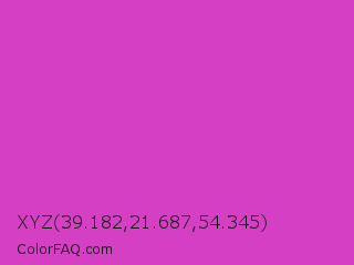 XYZ 39.182,21.687,54.345 Color is a normal magenta color and the nearest color is Steel Pink #cc33cc. Hex code #d53fc4 and RGB value is rgb(213,63,196). In RGB color space, this color is composed of 84% red, 25% green, 77% blue, In CMYK color space, this color is composed of 0% cyan, 70% magenta, 8% yellow , 16% black , In HSL color space, this color has a hue angle of 307° , 64% saturation and 54% lightness.