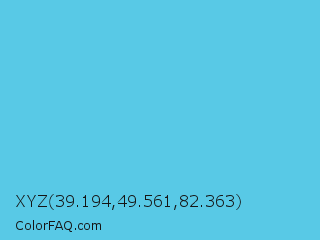 XYZ 39.194,49.561,82.363 Color is a light cyan color and the nearest color is Viking #64ccdb. Hex code #58c9e6 and RGB value is rgb(88,201,230). In RGB color space, this color is composed of 35% red, 79% green, 90% blue, In CMYK color space, this color is composed of 62% cyan, 13% magenta, 0% yellow , 10% black , In HSL color space, this color has a hue angle of 192° , 74% saturation and 62% lightness.