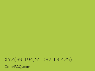 XYZ 39.194,51.087,13.425 Color is a normal lime color and the nearest color is Android Green #a4c639. Hex code #adc945 and RGB value is rgb(173,201,69). In RGB color space, this color is composed of 68% red, 79% green, 27% blue, In CMYK color space, this color is composed of 14% cyan, 0% magenta, 66% yellow , 21% black , In HSL color space, this color has a hue angle of 73° , 55% saturation and 53% lightness.