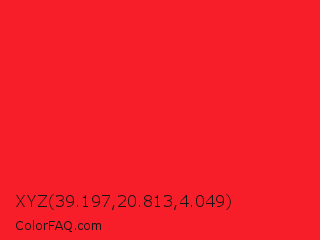 XYZ 39.197,20.813,4.049 Color is a normal red color and the nearest color is Red Pigment #ed1c24. Hex code #f71d29 and RGB value is rgb(247,29,41). In RGB color space, this color is composed of 97% red, 11% green, 16% blue, In CMYK color space, this color is composed of 0% cyan, 88% magenta, 83% yellow , 3% black , In HSL color space, this color has a hue angle of 357° , 93% saturation and 54% lightness.