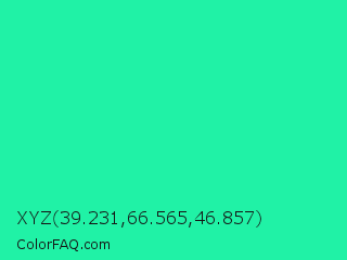 XYZ 39.231,66.565,46.857 Color is a normal green color and the nearest color is Medium Spring Green #00fa9a. Hex code #20f2a6 and RGB value is rgb(32,242,166). In RGB color space, this color is composed of 13% red, 95% green, 65% blue, In CMYK color space, this color is composed of 87% cyan, 0% magenta, 31% yellow , 5% black , In HSL color space, this color has a hue angle of 158° , 89% saturation and 54% lightness.