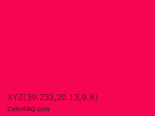 XYZ 39.233,20.13,9.8 Color is a normal rose color and the nearest color is Folly #ff004f. Hex code #f50552 and RGB value is rgb(245,5,82). In RGB color space, this color is composed of 96% red, 2% green, 32% blue, In CMYK color space, this color is composed of 0% cyan, 98% magenta, 67% yellow , 4% black , In HSL color space, this color has a hue angle of 341° , 96% saturation and 49% lightness.