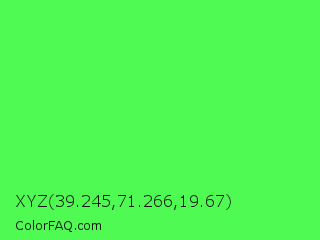 XYZ 39.245,71.266,19.67 Color is a light green color and the nearest color is Screamin Green #66ff66. Hex code #4ffb52 and RGB value is rgb(79,251,82). In RGB color space, this color is composed of 31% red, 98% green, 32% blue, In CMYK color space, this color is composed of 69% cyan, 0% magenta, 67% yellow , 2% black , In HSL color space, this color has a hue angle of 121° , 96% saturation and 65% lightness.