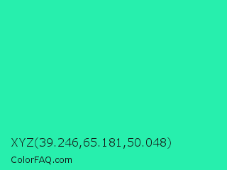XYZ 39.246,65.181,50.048 Color is a normal green color and the nearest color is Eucalyptus #44d7a8. Hex code #27efad and RGB value is rgb(39,239,173). In RGB color space, this color is composed of 15% red, 94% green, 68% blue, In CMYK color space, this color is composed of 84% cyan, 0% magenta, 28% yellow , 6% black , In HSL color space, this color has a hue angle of 160° , 86% saturation and 55% lightness.