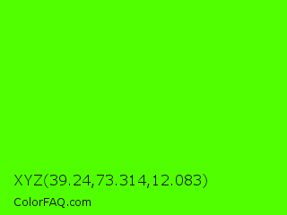 XYZ 39.24,73.314,12.083 Color is a normal green color and the nearest color is Chlorophyll Green #4aff00. Hex code #52ff00 and RGB value is rgb(82,255,0). In RGB color space, this color is composed of 32% red, 100% green, 0% blue, In CMYK color space, this color is composed of 68% cyan, 0% magenta, 100% yellow , 0% black , In HSL color space, this color has a hue angle of 101° , 100% saturation and 50% lightness.