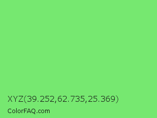XYZ 39.252,62.735,25.369 Color is a light green color and the nearest color is Pastel Green #77dd77. Hex code #76e870 and RGB value is rgb(118,232,112). In RGB color space, this color is composed of 46% red, 91% green, 44% blue, In CMYK color space, this color is composed of 49% cyan, 0% magenta, 52% yellow , 9% black , In HSL color space, this color has a hue angle of 117° , 72% saturation and 67% lightness.