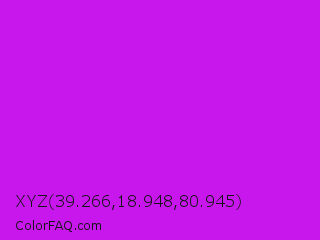 XYZ 39.266,18.948,80.945 Color is a normal purple color and the nearest color is Vivid Mulberry #b80ce3. Hex code #c817ec and RGB value is rgb(200,23,236). In RGB color space, this color is composed of 78% red, 9% green, 93% blue, In CMYK color space, this color is composed of 15% cyan, 90% magenta, 0% yellow , 7% black , In HSL color space, this color has a hue angle of 290° , 85% saturation and 51% lightness.