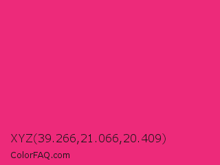XYZ 39.266,21.066,20.409 Color is a normal rose color and the nearest color is Razzmatazz #e3256b. Hex code #ed2a7a and RGB value is rgb(237,42,122). In RGB color space, this color is composed of 93% red, 16% green, 48% blue, In CMYK color space, this color is composed of 0% cyan, 82% magenta, 49% yellow , 7% black , In HSL color space, this color has a hue angle of 335° , 84% saturation and 55% lightness.