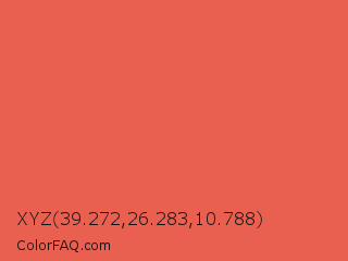 XYZ 39.272,26.283,10.788 Color is a light red color and the nearest color is Jelly Bean #da614e. Hex code #e96051 and RGB value is rgb(233,96,81). In RGB color space, this color is composed of 91% red, 38% green, 32% blue, In CMYK color space, this color is composed of 0% cyan, 59% magenta, 65% yellow , 9% black , In HSL color space, this color has a hue angle of 6° , 78% saturation and 62% lightness.