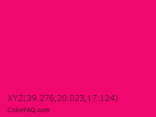 XYZ 39.276,20.023,17.124 Color is a normal rose color and the nearest color is Vivid Raspberry #ff006c. Hex code #f10770 and RGB value is rgb(241,7,112). In RGB color space, this color is composed of 95% red, 3% green, 44% blue, In CMYK color space, this color is composed of 0% cyan, 97% magenta, 54% yellow , 5% black , In HSL color space, this color has a hue angle of 333° , 94% saturation and 49% lightness.