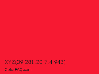 XYZ 39.281,20.7,4.943 Color is a normal red color and the nearest color is Torch Red #fd0e35. Hex code #f71932 and RGB value is rgb(247,25,50). In RGB color space, this color is composed of 97% red, 10% green, 20% blue, In CMYK color space, this color is composed of 0% cyan, 90% magenta, 80% yellow , 3% black , In HSL color space, this color has a hue angle of 353° , 93% saturation and 53% lightness.