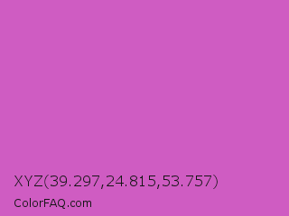 XYZ 39.297,24.815,53.757 Color is a normal magenta color and the nearest color is Fuchsia Pink #c154c1. Hex code #cf5cc2 and RGB value is rgb(207,92,194). In RGB color space, this color is composed of 81% red, 36% green, 76% blue, In CMYK color space, this color is composed of 0% cyan, 56% magenta, 6% yellow , 19% black , In HSL color space, this color has a hue angle of 307° , 55% saturation and 59% lightness.