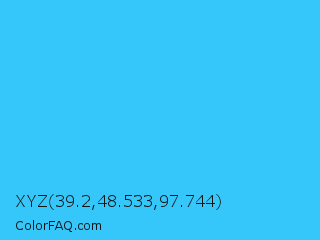 XYZ 39.2,48.533,97.744 Color is a normal blue color and the nearest color is Picton Blue #45b1e8. Hex code #36c7fa and RGB value is rgb(54,199,250). In RGB color space, this color is composed of 21% red, 78% green, 98% blue, In CMYK color space, this color is composed of 78% cyan, 20% magenta, 0% yellow , 2% black , In HSL color space, this color has a hue angle of 196° , 95% saturation and 60% lightness.