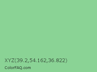 XYZ 39.2,54.162,36.822 Color is a light green color and the nearest color is Eton Blue #96c8a2. Hex code #8ad395 and RGB value is rgb(138,211,149). In RGB color space, this color is composed of 54% red, 83% green, 58% blue, In CMYK color space, this color is composed of 35% cyan, 0% magenta, 29% yellow , 17% black , In HSL color space, this color has a hue angle of 129° , 45% saturation and 68% lightness.