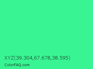 XYZ 39.304,67.678,38.595 Color is a normal green color and the nearest color is Eucalyptus #44d7a8. Hex code #39f493 and RGB value is rgb(57,244,147). In RGB color space, this color is composed of 22% red, 96% green, 58% blue, In CMYK color space, this color is composed of 77% cyan, 0% magenta, 40% yellow , 4% black , In HSL color space, this color has a hue angle of 149° , 89% saturation and 59% lightness.