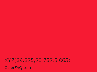 XYZ 39.325,20.752,5.065 Color is a normal red color and the nearest color is Torch Red #fd0e35. Hex code #f71a33 and RGB value is rgb(247,26,51). In RGB color space, this color is composed of 97% red, 10% green, 20% blue, In CMYK color space, this color is composed of 0% cyan, 89% magenta, 79% yellow , 3% black , In HSL color space, this color has a hue angle of 353° , 93% saturation and 54% lightness.
